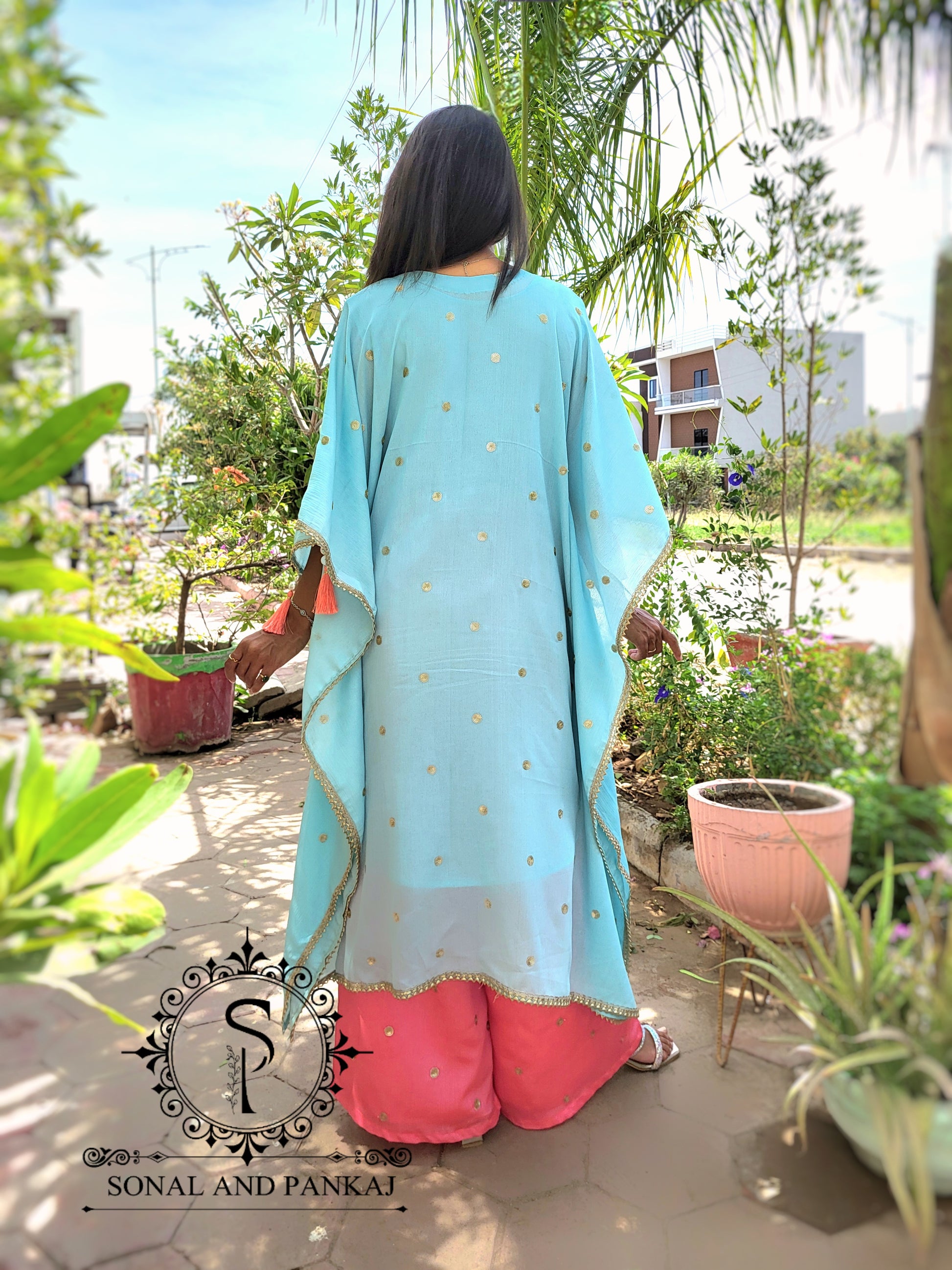 Sky blue kaftan with inner with coral pants.