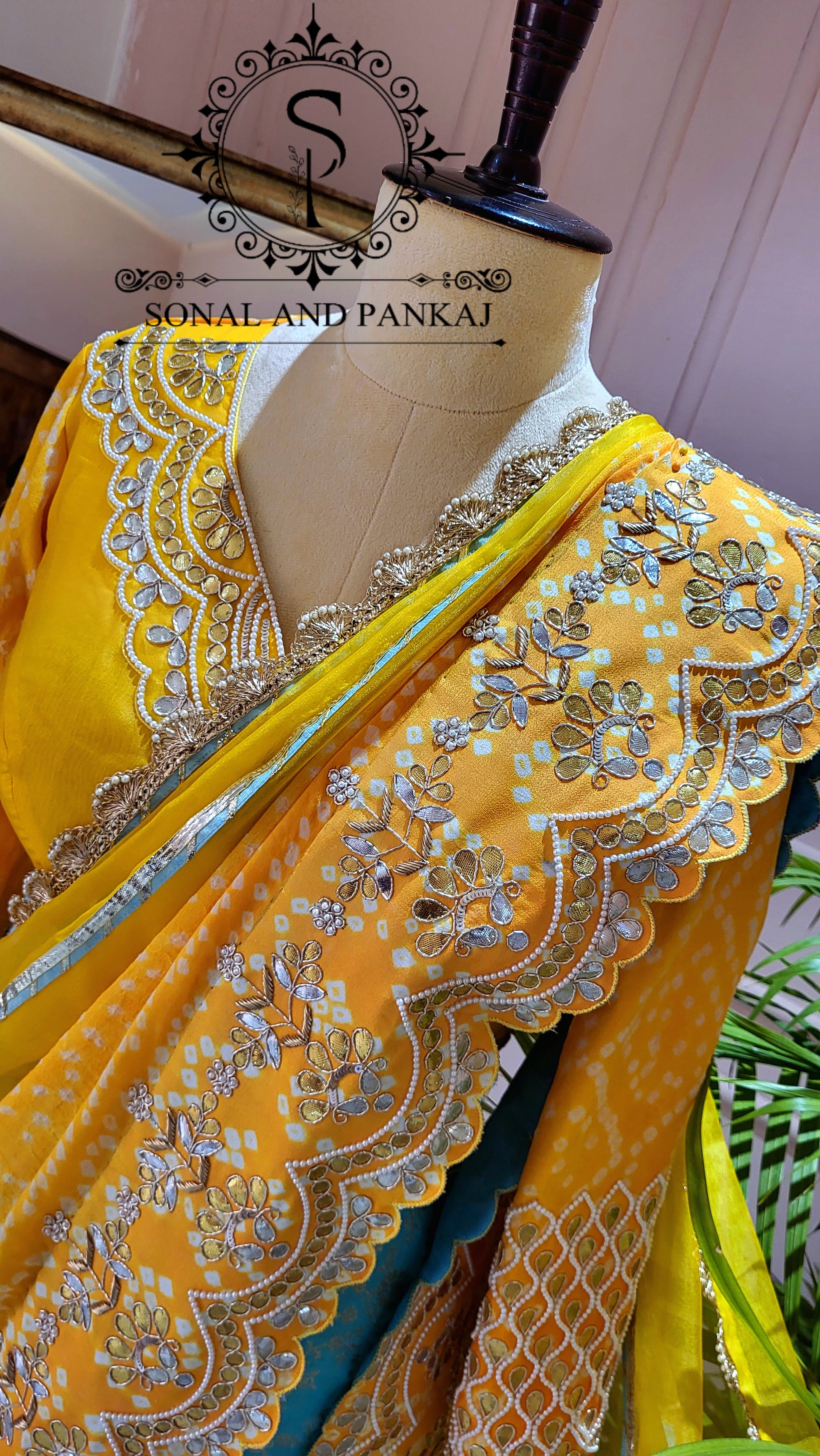 Yellow Gotta Patti Hand Embroidered Blouse & Ready To Drape Designer Bandhani Saree - SA01445