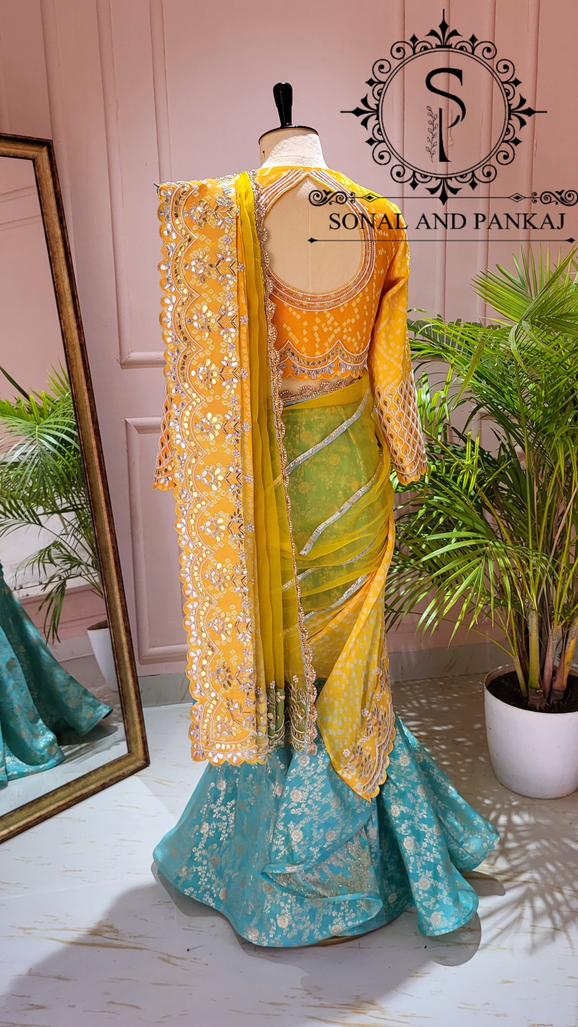 The ombre yellow Bandhani blouse features exclusive Gotta Patti handwork, exuding sophistication.
